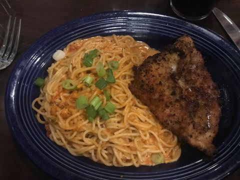 Vorweg gab es Pellkartoffeln und Butter 😋. Am liebsten hätte ich mein Essen abbestellt und wäre bei den Kartoffeln geblieben. Aber ich habe die leckere Pasta mit Chicken genossen🤓