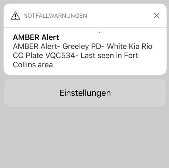 Unsere iPhones und meine Watch haben auf einmal ganz lauten Alarm gegeben. Dieser Alarmton war uns beiden unbekannt und eben sehr laut. Auf unseren Handys erschien dann ein "Amber Alert".