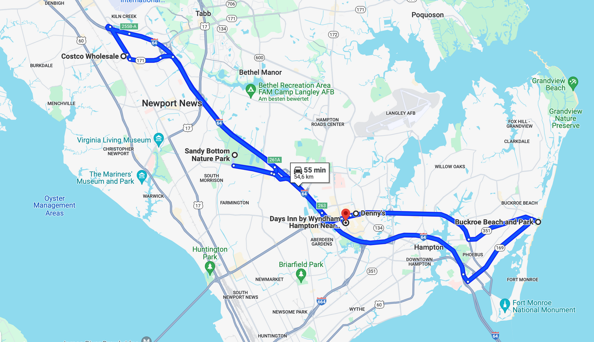 Hier in Hampton/Virginia ist wohl die größte Base der US Army. Wir haben ja schon einen Flugzeugträger gesehen und heute die dazugehörigen Flugzeuge. Sie flogen den ganzen Tag über die Stadt. Ich vermute, da war Maverick am Start.