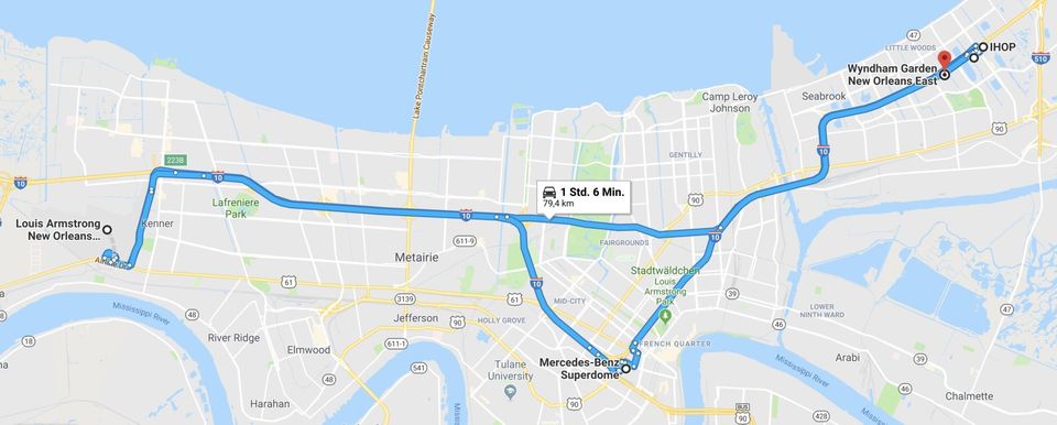 Anschließend haben wir noch einen kleinen Umweg zum Superdome gemacht (Fotos hat Ben und der gibt sich gerade dem Jetlag hin und schläft tief und fest), kurz die Grundversorgung für Ben im Walmart besorgt und zu guter Letzt, gab´s Dinner im IHOP😋