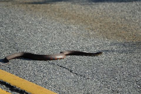 Fast hätte Harry sie überfahren. Abruptes Bremsen, Lenkrad rumreißen, wieder Gas geben, Warnblink an, rechts ranfahren, Kamera schnappen, losrennen und fotografieren. Und das alles in unter 10 Sekunden. Leider war die Schlange zu schnell und die Kamera hat nicht schnell genug fokusiert. Oder da war jemand zu aufgeregt🤩?