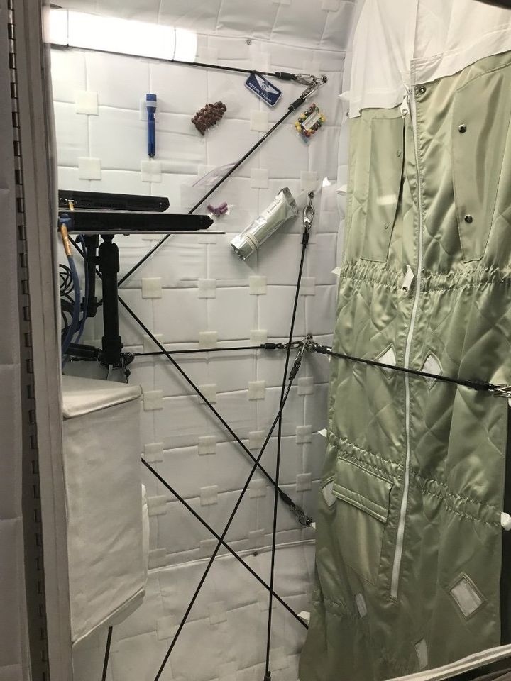 So sehen die persönlichen Bereiche der Astronauten aus. Das Bett ist hochkant. Jedenfalls hier auf der Erde.