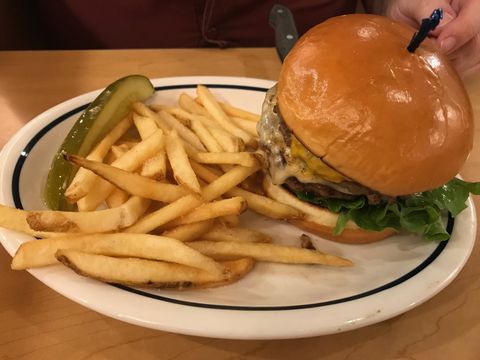 linkes Foto: ein Bacon Cheeseburger